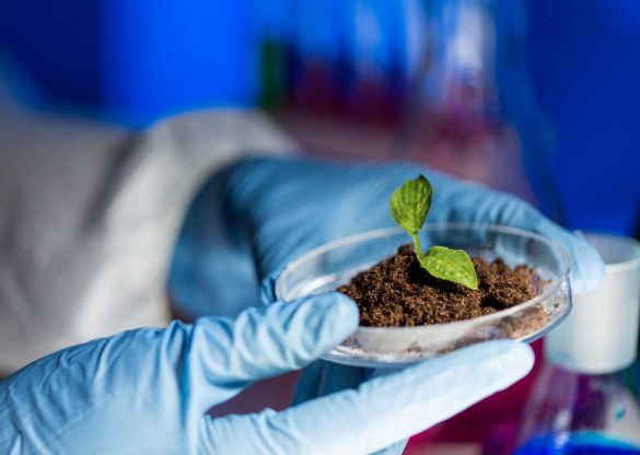 science, biology, ecology, research and people concept - close up of scientist hands holding petri dish with plant and soil sample in bio laboratory