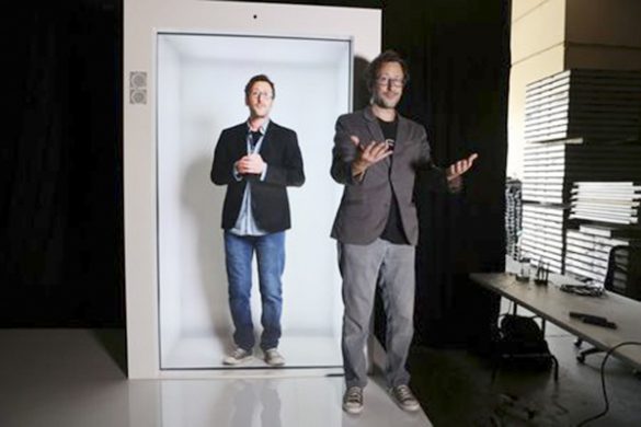 El inventor del dispositivo, David Nussbaum, posa para una foto junto a un holograma de tamaño real con inteligencia artificial de él mismo en Gardena, cerca de Los Ángeles, California, EEUU. 3 de agosto de 2020. REUTERS/Lucy Nicholson