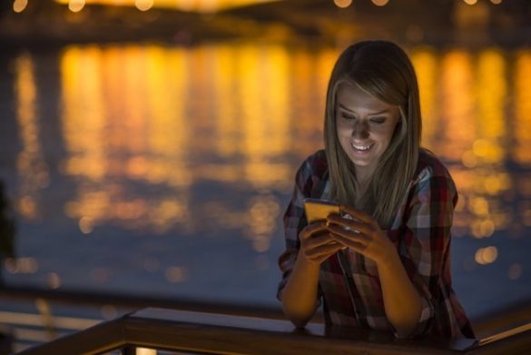 woman using smartphone in city at night. Woman sending text message on phone